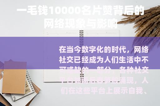 “一毛钱10000名片赞”作为一种网络现象,既反映了当下社会中人们对于社交认可和快速成功的追求,也揭示了网络社交中存在的一些问题和挑战,我们应该以理性和客观的态度来看待这种现象,既要认识到它所带来的便利和机会,也要警惕它可能带来的负面影响,在网络社交中,我们应该坚持真实、诚信的原则,通过不断提升自己的能力和素质,发布有价值的内容,积极参与社交互动,来获得真正的认可和关注,建立起健康、有意义的社交关系,我们才能在虚拟的网络世界中找到属于自己的价值和归属感,实现真正的社交满足。