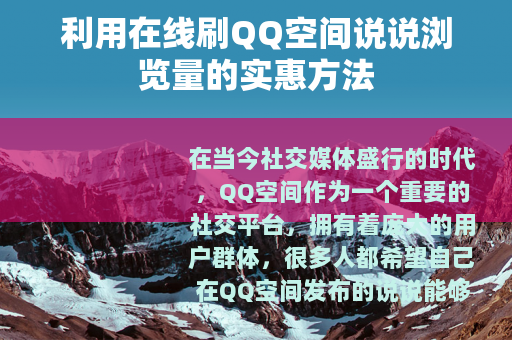 在当今社交媒体盛行的时代,QQ空间作为一个重要的社交平台,拥有着庞大的用户群体,很多人都希望自己在QQ空间发布的说说能够获得更多的浏览量,以此来增加自己的人气和关注度,而在线刷QQ空间说说浏览量因其价格便宜,成为了不少人的选择。