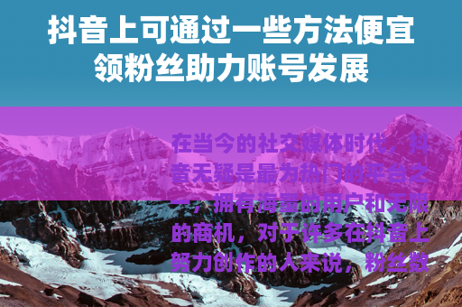 在当今的社交媒体时代,抖音无疑是最为热门的平台之一,拥有海量的用户和无限的商机,对于许多在抖音上努力创作的人来说,粉丝数量是衡量其成功与否的一个重要指标,而如何能够以更便宜的方式领取粉丝,从而提升自己账号的影响力,成为了不少人关注的焦点。