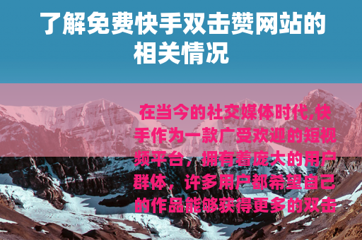 在当今的社交媒体时代,快手作为一款广受欢迎的短视频平台,拥有着庞大的用户群体,许多用户都希望自己的作品能够获得更多的双击赞,以此来提升自己的人气和影响力,在这样的需求下,免费快手双击赞网站应运而生。