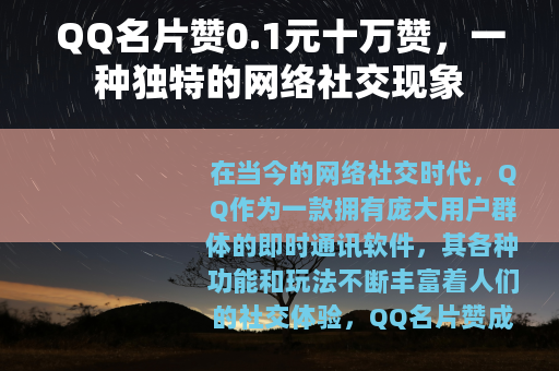 在当今的网络社交时代,QQ作为一款拥有庞大用户群体的即时通讯软件,其各种功能和玩法不断丰富着人们的社交体验,QQ名片赞成为了许多用户关注的一个点,而“QQ名片赞0.1元十万赞”的现象也随之悄然兴起。