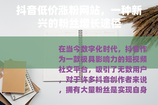 在当今数字化时代,抖音作为一款极具影响力的短视频社交平台,吸引了无数用户,对于许多抖音创作者来说,拥有大量粉丝是实现自身价值和商业变现的重要基础,在这种需求下,抖音低价涨粉网站应运而生,为创作者们提供了一种看似便捷的粉丝增长途径。