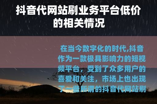 在当今数字化的时代,抖音作为一款极具影响力的短视频平台,受到了众多用户的喜爱和关注,市场上也出现了一些所谓的抖音代网站刷业务平台,它们以低价为卖点吸引着不少人的目光。