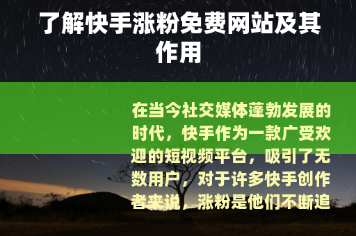 在当今社交媒体蓬勃发展的时代,快手作为一款广受欢迎的短视频平台,吸引了无数用户,对于许多快手创作者来说,涨粉是他们不断追求的目标之一,而快手涨粉免费网站也因此应运而生。