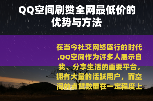 在当今社交网络盛行的时代,QQ空间作为许多人展示自我、分享生活的重要平台,拥有大量的活跃用户,而空间的点赞数量在一定程度上反映了一个人的人气和受欢迎程度,很多人都希望自己的QQ空间能够获得更多的赞,在众多获取QQ空间赞的方式中,全网最低价的刷赞服务受到了不少人的关注。