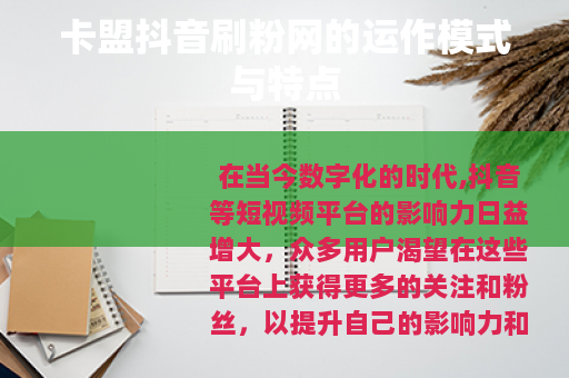 卡盟抖音刷粉网是一个为抖音用户提供粉丝增长服务的网络平台,它通过一系列的技术手段和操作流程,帮助用户在抖音上快速增加粉丝数量,这些平台通常拥有一套较为完善的系统,用户只需在其网站上进行简单的注册和操作,就可以选择自己所需要的粉丝数量套餐。