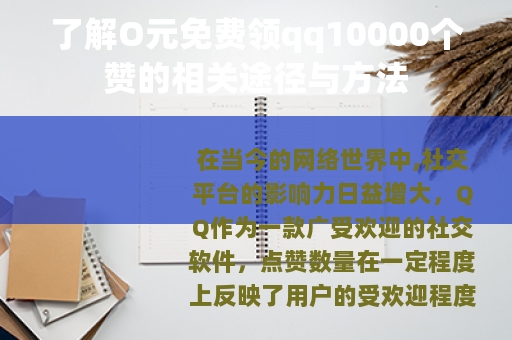在当今的网络世界中,社交平台的影响力日益增大,QQ作为一款广受欢迎的社交软件,点赞数量在一定程度上反映了用户的受欢迎程度和内容的热度,很多人都希望能够获得更多的QQ赞,而“O元免费领qq10000个赞”这样的信息也随之出现,吸引了众多用户的目光。