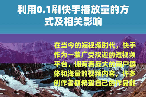 在当今的短视频时代,快手作为一款广受欢迎的短视频平台,拥有着庞大的用户群体和海量的视频内容,许多创作者都希望自己的作品能够获得更多的播放量,从而提高知名度和影响力,而有一种方式逐渐受到关注,那就是以0.1的价格刷快手播放量。