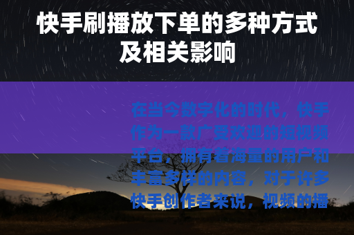 在当今数字化的时代,快手作为一款广受欢迎的短视频平台,拥有着海量的用户和丰富多样的内容,对于许多快手创作者来说,视频的播放量是衡量其作品受欢迎程度的重要指标之一,快手刷播放下单的现象也随之出现。