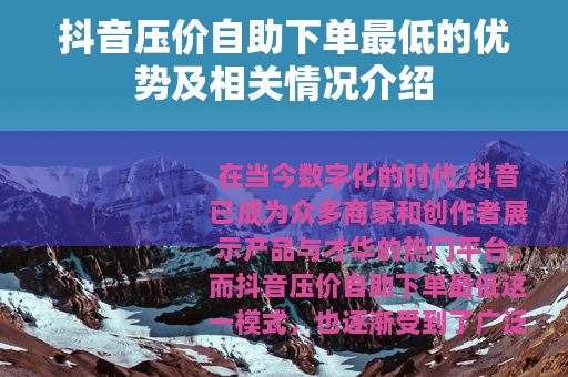 在当今数字化的时代,抖音已成为众多商家和创作者展示产品与才华的热门平台,而抖音压价自助下单最低这一模式,也逐渐受到了广泛的关注。