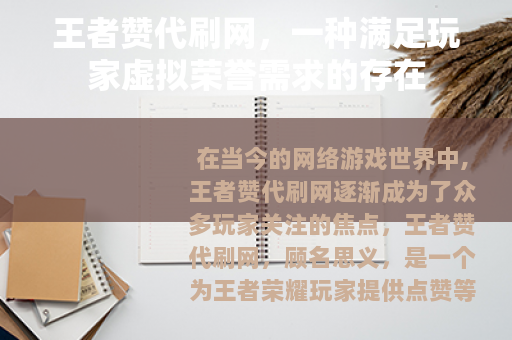 在当今的网络游戏世界中,王者赞代刷网逐渐成为了众多玩家关注的焦点,王者赞代刷网,顾名思义,是一个为王者荣耀玩家提供点赞等相关虚拟数据代刷服务的平台。