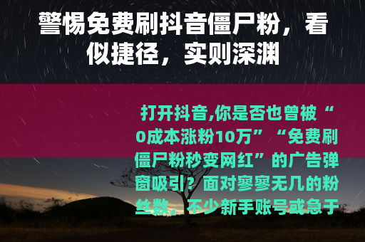 打开抖音,你是否也曾被“0成本涨粉10万”“免费刷僵尸粉秒变网红”的广告弹窗吸引?面对寥寥无几的粉丝数,不少新手账号或急于求成的创作者,可能会动起“走捷径”的念头,但你知道吗?“免费刷僵尸粉”不仅无法帮你实现流量梦,反而可能让账号陷入万劫不复的境地——信息泄露、账号封禁、流量清零,这些代价远比“免费”二字沉重。