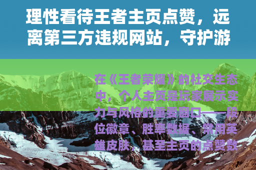 在《王者荣耀》的社交生态中,个人主页是玩家展示实力与风格的重要窗口——段位徽章、胜率数据、常用英雄皮肤,甚至主页的点赞数,都成为许多玩家“成就感”的一部分,正因如此,“提升主页点赞数”的需求应运而生,随之而来的是各类声称能“快速刷赞”的第三方网站在网络上悄然出现,这些看似便捷的工具背后,却隐藏着不容忽视的风险,更与游戏的公平性和账号安全背道而驰。
