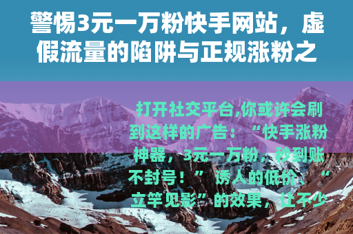 打开社交平台,你或许会刷到这样的广告:“快手涨粉神器,3元一万粉,秒到账不封号!” 诱人的低价、“立竿见影”的效果,让不少急于提升账号热度的用户心动不已,但真相是——这些所谓的“3元一万粉快手网站”,大多是精心设计的骗局,背后藏着损害账号、盗取利益的风险。