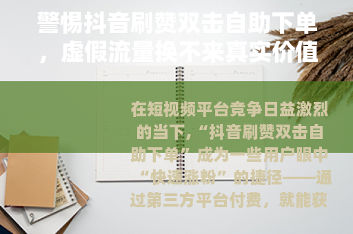 在短视频平台竞争日益激烈的当下,“抖音刷赞双击自助下单”成为一些用户眼中“快速涨粉”的捷径——通过第三方平台付费,就能获得批量虚假点赞、双击等互动数据,看似能让作品“上热门”“被看见”,实则暗藏多重风险,不仅违背平台规则,更会透支账号的长期价值。