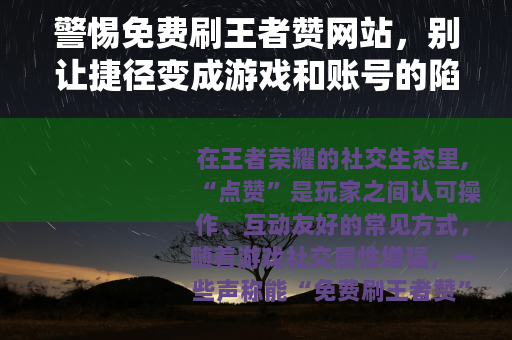 在王者荣耀的社交生态里,“点赞”是玩家之间认可操作、互动友好的常见方式,随着游戏社交属性增强,一些声称能“免费刷王者赞”的网站开始在玩家群体中传播,打着“零成本、秒到账、不封号”的旗号吸引眼球,但看似诱人的“捷径”背后,藏着不少看不见的风险,甚至可能让你付出远超预期的代价。