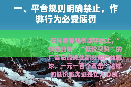在抖音等短视频平台上,“快速涨粉”“低价买赞”的广告总能抓住部分用户的眼球,一元一百个双击”这样的低价服务更是让人心动,这种看似“性价比极高”的操作,背后却藏着不少隐患,甚至可能让账号陷入无法挽回的困境。 抖音的社区规范和运营规则中,早已明确禁止任何形式的刷赞、刷量、刷粉等作弊行为,平台的智能算法会通过多维度数据检测(如点赞来源的真实性、互动的连贯性、账号的活跃时间等),精准识别非自然增长的账号,一旦被判定违规,账号将面临限流、降权的处罚——发布的视频无法进入推荐流,甚至仅自己可见;严重者会被永久封号,此前积累的内容和粉丝将全部清零,付出的时间与精力付诸东流。