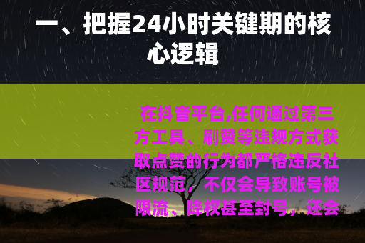 在抖音平台,任何通过第三方工具、刷赞等违规方式获取点赞的行为都严格违反社区规范,不仅会导致账号被限流、降权甚至封号,还会损害账号的长期健康发展,因此绝对不建议尝试。 如果希望视频在24小时内获得更多自然点赞,核心在于提升内容质量和匹配平台推荐逻辑,以下是合规有效的建议: 抖音算法会优先根据视频发布后24小时内的“冷启动数据”(完播率、点赞率、评论率、转发率、收藏率)判断内容质量,决定是否推入更大流量池,前24小时的数据直接影响视频后续的曝光潜力。