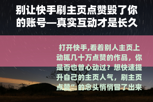 打开快手,看着别人主页上动辄几十万点赞的作品,你是否也曾心动过?想快速提升自己的主页人气,刷主页点赞”的念头悄悄冒了出来?但请打住——“快手刷主页点赞”不仅不是捷径,反而是毁掉账号的“毒药”,今天咱们就聊聊这个话题,帮你避开陷阱,找到真正的涨赞之道。
