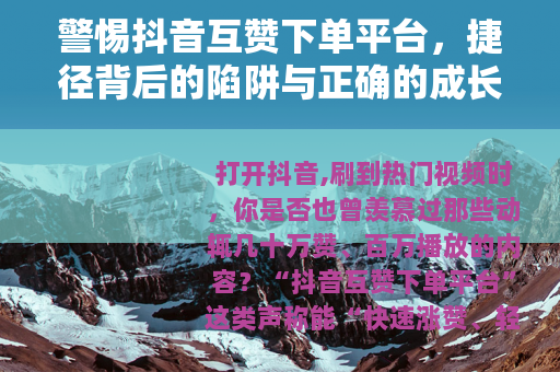 打开抖音,刷到热门视频时,你是否也曾羡慕过那些动辄几十万赞、百万播放的内容?“抖音互赞下单平台”这类声称能“快速涨赞、轻松上热门”的服务,开始悄悄出现在视线里——它们打着“低成本获流量”的旗号,吸引着急于求成的创作者,但你知道吗?这些看似诱人的“捷径”,背后藏着多少看不见的风险?