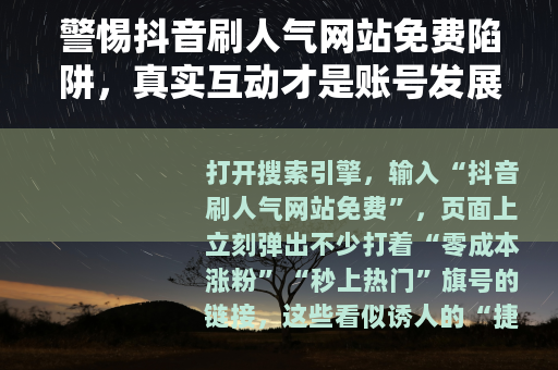 打开搜索引擎,输入“抖音刷人气网站免费”,页面上立刻弹出不少打着“零成本涨粉”“秒上热门”旗号的链接,这些看似诱人的“捷径”,真的能帮你快速提升账号人气吗?答案是否定的——免费刷人气不仅违反抖音平台规则,更藏着账号被盗、隐私泄露、诈骗勒索等多重风险,最终只会让你的账号陷入“虚假繁荣”的死胡同。