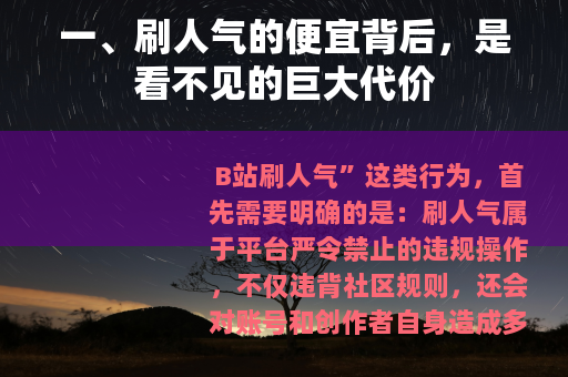 B站刷人气”这类行为,首先需要明确的是:刷人气属于平台严令禁止的违规操作,不仅违背社区规则,还会对账号和创作者自身造成多重危害,绝不可取,以下从风险警示、正确路径两方面展开分析,帮助大家认清真相、避开陷阱: 很多人被“最便宜”吸引,却忽略了刷人气的本质是数据造假,其后果远超想象: