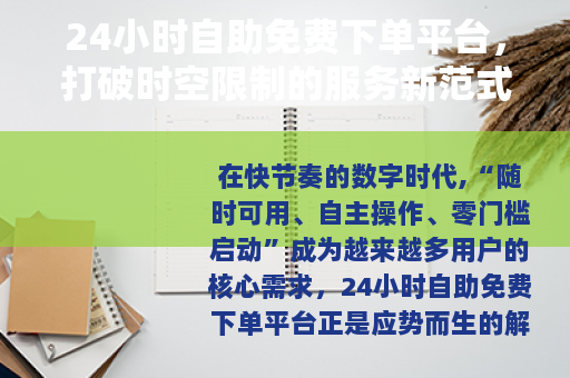 在快节奏的数字时代,“随时可用、自主操作、零门槛启动”成为越来越多用户的核心需求,24小时自助免费下单平台正是应势而生的解决方案——它像一位永远在线的“智能助手”,打破了时间与空间的壁垒,让服务对接变得更高效、更灵活,成为连接供需两端的重要桥梁。