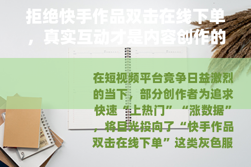 在短视频平台竞争日益激烈的当下,部分创作者为追求快速“上热门”“涨数据”,将目光投向了“快手作品双击在线下单”这类灰色服务,这种试图通过付费刷量获取虚假互动的行为,不仅违背平台规则,更会对账号发展造成不可逆的伤害——价值与用户互动,才是创作者立足快手的核心根基。