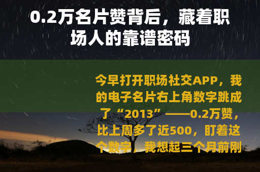 今早打开职场社交APP,我的电子名片右上角数字跳成了“2013”——0.2万赞,比上周多了近500,盯着这个数字,我想起三个月前刚更新名片时,点赞数还只有几十,如今的增长,像一颗慢慢发芽的种子,终于开出了小花。
