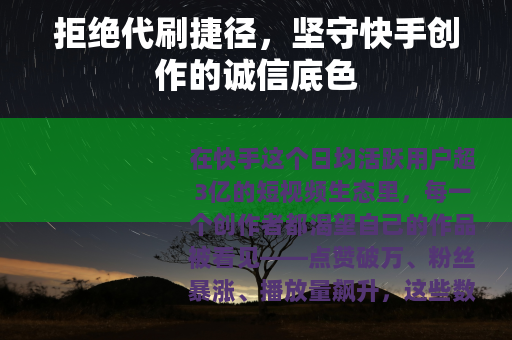 作为创作者,我们应该坚守诚信的底色:拒绝代刷捷径,用真实的内容说话,用真诚的态度运营,唯有如此,才能在快手的舞台上走得稳、走得远,让自己的作品真正被看见、被记住。