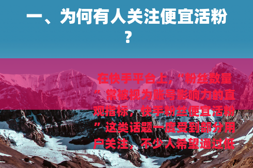 在快手平台上,“粉丝数量”常被视为账号影响力的直观指标,快手粉丝便宜活粉”这类话题一度受到部分用户关注,不少人希望通过低成本方式快速提升粉丝量,但这种做法背后隐藏着诸多风险,并非账号成长的明智之选。 追求“便宜活粉”的动机往往源于三类需求: