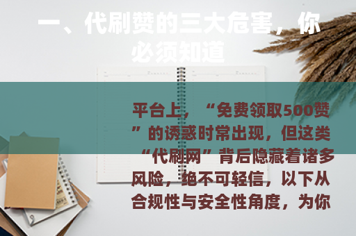平台上,“免费领取500赞”的诱惑时常出现,但这类“代刷网”背后隐藏着诸多风险,绝不可轻信,以下从合规性与安全性角度,为你解析为何要远离此类行为,并给出正确的涨粉建议: