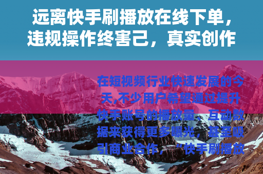 在短视频行业快速发展的今天,不少用户希望通过提升快手账号的播放量、互动数据来获得更多曝光,甚至吸引商业合作。“快手刷播放在线下单”这类违规服务悄然出现——一些所谓的“服务商”通过线下渠道招揽生意,声称能快速为账号刷取大量播放量、点赞、评论等虚假数据,这种看似“捷径”的操作,背后隐藏着巨大的风险,不仅违反平台规则,更会对账号和个人利益造成不可逆的损害。