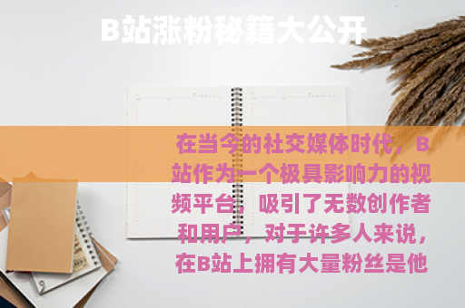 在当今的社交媒体时代,B站作为一个极具影响力的视频平台,吸引了无数创作者和用户,对于许多人来说,在B站上拥有大量粉丝是他们的梦想,因为这不仅意味着自己的作品得到了更多人的认可,还可能带来各种商业机会和收益,如何在B站实现涨粉呢?下面就为大家分享一些实用的方法。 质量是关键,要想在B站吸引粉丝,就必须提供有价值、有趣、有特色的视频内容,这需要创作者深入了解自己的目标受众,知道他们感兴趣的话题和类型,然后根据这些来策划和制作视频,无论是搞笑、游戏、知识科普还是生活记录等各种类型,只要能做到内容精良,就有机会脱颖而出。