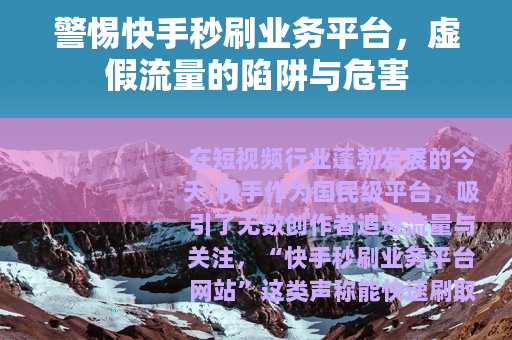 在短视频行业蓬勃发展的今天,快手作为国民级平台,吸引了无数创作者追逐流量与关注。“快手秒刷业务平台网站”这类声称能快速刷取粉丝、点赞、评论的服务,却像隐藏在流量背后的毒瘤,不仅破坏平台生态,更给用户带来多重风险。