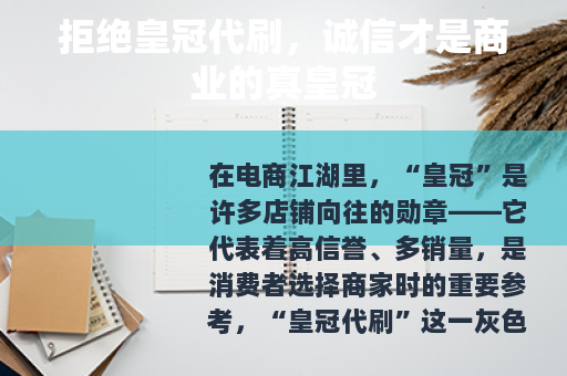在电商江湖里,“皇冠”是许多店铺向往的勋章——它代表着高信誉、多销量,是消费者选择商家时的重要参考。“皇冠代刷”这一灰色操作却像幽灵般徘徊在行业边缘,看似能快速“登顶”,实则是一条布满荆棘的歧途。