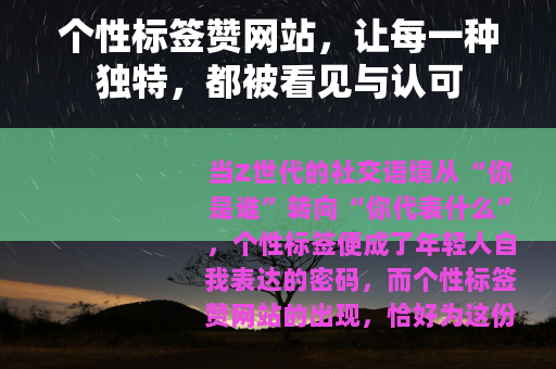 当Z世代的社交语境从“你是谁”转向“你代表什么”,个性标签便成了年轻人自我表达的密码,而个性标签赞网站的出现,恰好为这份密码搭建了一个温暖的舞台——每一个标签都是一次自我宣言,每一个点赞都是一份跨越屏幕的共鸣,它不仅是展示个性的窗口,更是连接同好、传递认可的桥梁,让“独特”不再孤独,让“小众”也能找到归属。