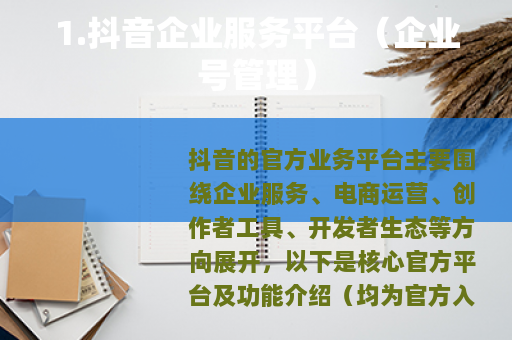 抖音的官方业务平台主要围绕企业服务、电商运营、创作者工具、开发者生态等方向展开,以下是核心官方平台及功能介绍(均为官方入口,建议通过抖音官网跳转访问,避免非官方渠道风险):