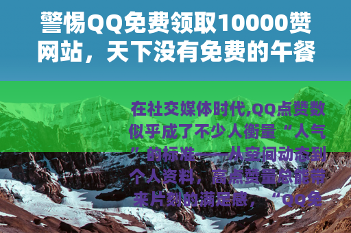 在社交媒体时代,QQ点赞数似乎成了不少人衡量“人气”的标准——从空间动态到个人资料,高点赞量总能带来片刻的满足感。“QQ免费领取10000赞”的网站悄然兴起,打着“零成本、秒到账”的旗号,吸引着无数想快速提升“存在感”的用户,这些看似诱人的服务背后,藏着多少不为人知的风险?