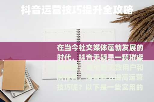 在当今社交媒体蓬勃发展的时代,抖音无疑是一颗璀璨的明星,吸引着无数用户和创作者,抖音怎么提高运营技巧呢?以下是一些实用的方法,助你在抖音平台上取得更好的成绩。