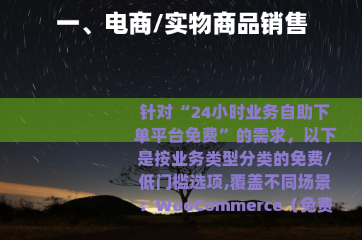 针对“24小时业务自助下单平台免费”的需求,以下是按业务类型分类的免费/低门槛选项,覆盖不同场景: