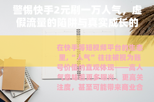 在快手等短视频平台的生态里,“人气”往往被视为账号价值的直观体现——高人气意味着更多曝光、更高关注度,甚至可能带来商业合作机会,一些声称“2元刷一万人气”的宣传悄然出现,瞄准了部分用户急于求成的心理,这种看似“性价比极高”的操作,实则是一条布满风险的歧路,不仅违背平台规则,更会损害账号的长远发展。