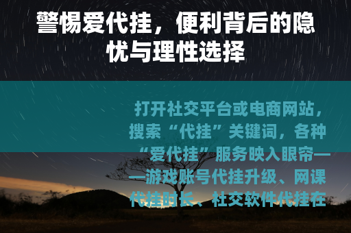 打开社交平台或电商网站,搜索“代挂”关键词,各种“爱代挂”服务映入眼帘——游戏账号代挂升级、网课代挂时长、社交软件代挂在线状态……这些服务仿佛成了忙碌现代人的“时间救星”,但在便利背后,隐藏着不少值得警惕的问题。