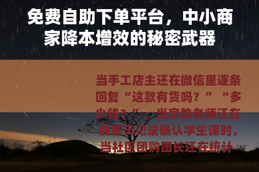 当手工店主还在微信里逐条回复“这款有货吗?”“多少钱?”,当家教老师还在翻聊天记录确认学生课时,当社区团购团长还在统计 Excel 订单到深夜——他们或许都忽略了一个能彻底解放双手的工具:免费自助下单平台。