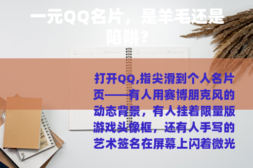 “QQ名片一元定制”的广告在短视频平台、校园社群里刷屏:“一块钱,让你的名片秒变高级感!”“动漫背景+动态特效+专属头像框,全包!” 一杯矿泉水的价格,就能拥有别人羡慕的“顶配”名片,这对没有收入的学生党来说,几乎是“零门槛”的诱惑,但这块钱,真的能买到你想要的“个性”吗?