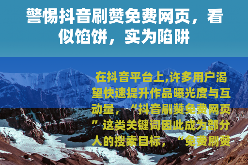 在抖音平台上,许多用户渴望快速提升作品曝光度与互动量,“抖音刷赞免费网页”这类关键词因此成为部分人的搜索目标。“免费刷赞”从来都不是真正的“福利”,其背后隐藏着账号安全、平台处罚、法律风险等多重危机,甚至可能让你得不偿失。