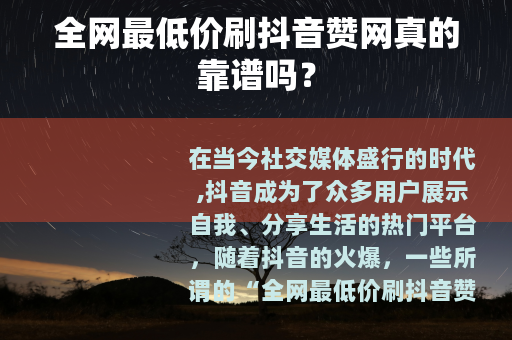在当今社交媒体盛行的时代,抖音成为了众多用户展示自我、分享生活的热门平台,随着抖音的火爆,一些所谓的“全网最低价刷抖音赞网”也应运而生,吸引了不少人的关注,但这些刷赞网真的像它们所宣传的那样美好吗?