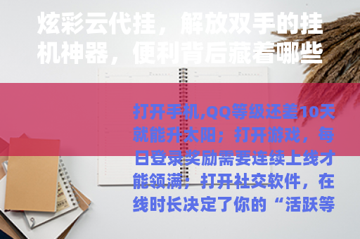 打开手机,QQ等级还差10天就能升太阳;打开游戏,每日登录奖励需要连续上线才能领满;打开社交软件,在线时长决定了你的“活跃等级”……在这个“时长即特权”的时代,很多人都面临一个问题:没时间天天挂机,却想拿到那些诱人的奖励,这时,“炫彩云代挂”这类工具应运而生,成为不少人的“时间救星”。