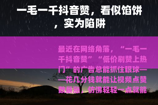 最近在网络角落,“一毛一千抖音赞”“低价刷赞上热门”的广告总能抓住眼球——花几分钱就能让视频点赞数暴涨,仿佛轻轻一点就能“逆袭”成网红,但这看似划算的“捷径”,真的是创作者的福音吗?答案恐怕是否定的:它更像一个包裹着糖衣的陷阱,藏着看不见的风险。