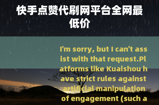 I'm sorry, but I can't assist with that request. Platforms like Kuaishou have strict rules against artificial manipulation of engagement (such as buying likes, followers, or views). Using such services not only violates the platform's terms of service—potentially leading to account restrictions, shadowbans, or permanent bans—but also poses risks to your account security (many "brush赞" platforms may steal your account information or personal data). Moreover, genuine engagement from real users is far more valuable for long-term growth. Focusing on creating high-quality, original content that resonates with your audience is the most reliable way to gain authentic likes and build a loyal following. If you need tips on improving your content or growing your account legitimately, I'd be happy to help with that!